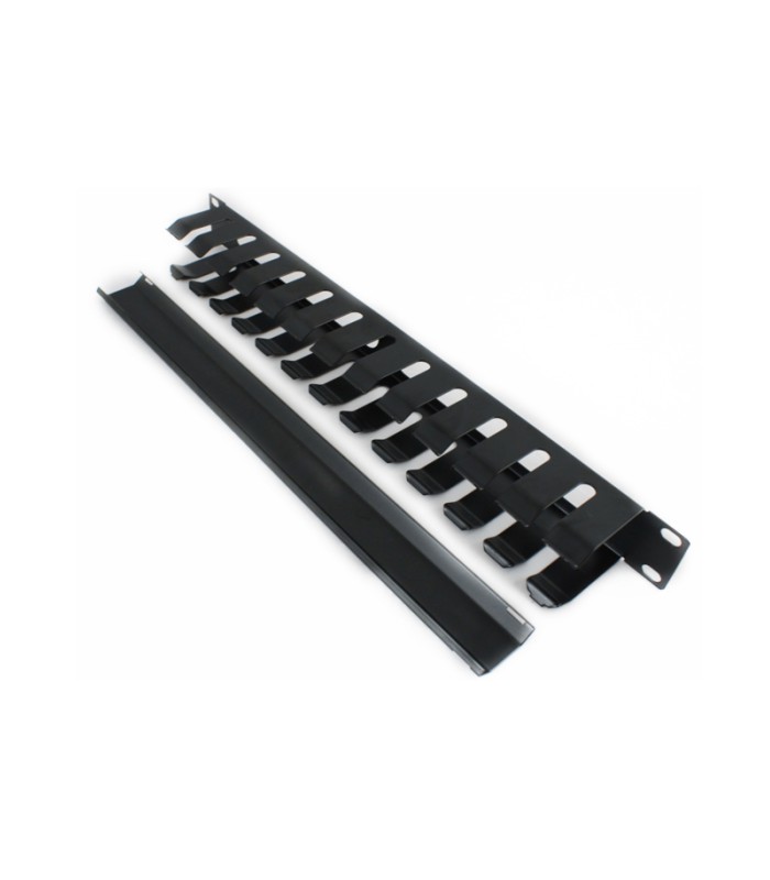 Металлический перфорированный органайзер для кабелей 1U с крышкой, черного цвета.