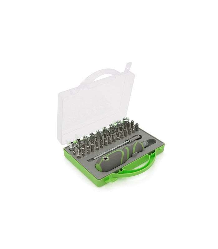 Отвертка с набором насадок и головок 41-в-1 предназначена для удобного и эффективного использования при проведении различных видов монтажных работ.
