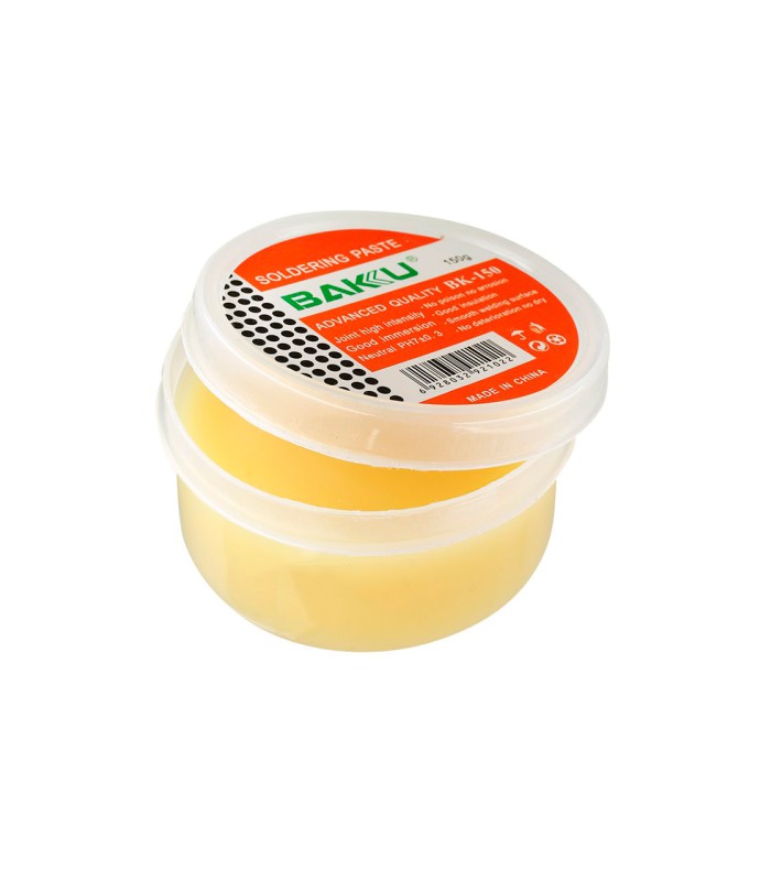 Паяльная паста BAKU BK-150 – это флюс, основанный на канифоли, без содержания кислот, что делает его безопасным для пайки мелких деталей. Паста превосходно подходит для установки микросхем в корпусах BGA, PGA, PLCC, QFP, CSP и обладает отличной способностью проникать в рабочие поверхности.