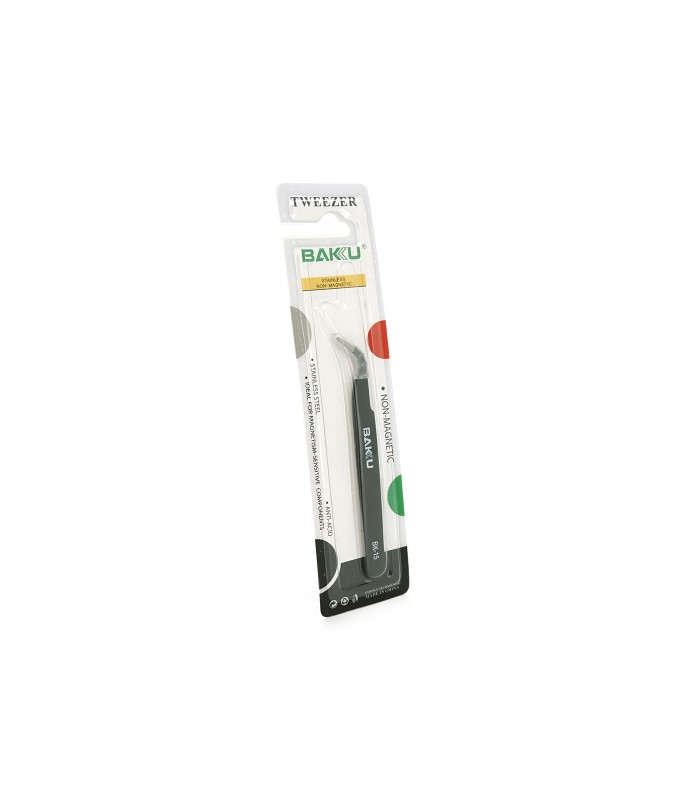 Пинцет BAKU BK-15ESD - это выгнутый металлический инструмент с черным антистатическим покрытием, предназначенный для мелкой работы при обращении с электронными компонентами.