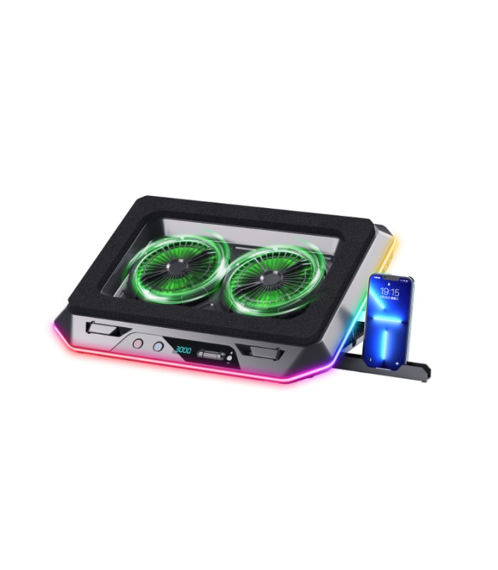 Продуманный дизайн включает в себя 2 USB-порта и LCD-дисплей для удобства использования. Корпус подставки выполнен из пластика и сетки, что гарантирует ее прочность и долговечность.