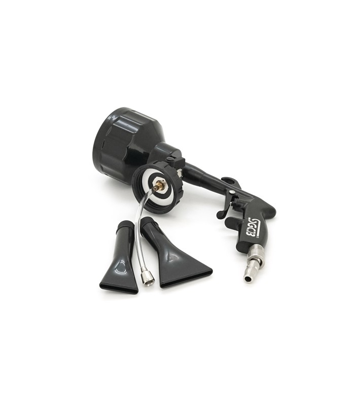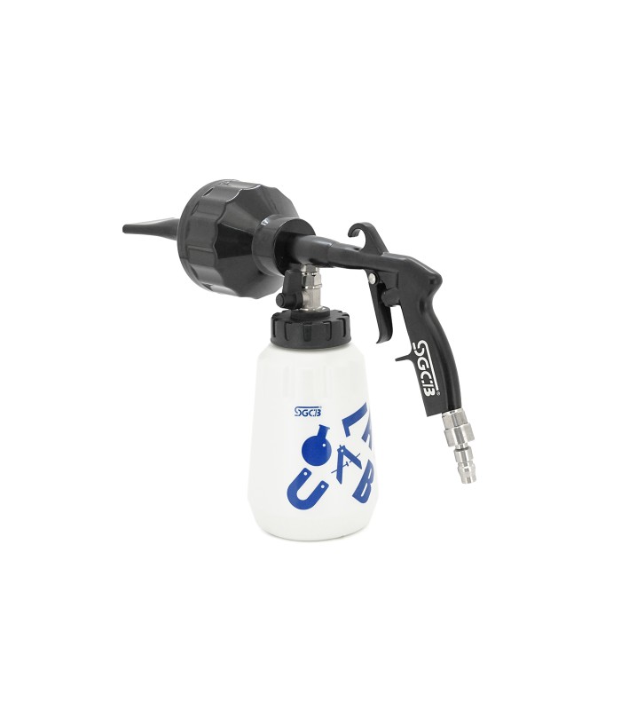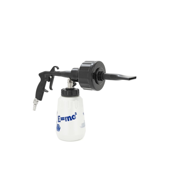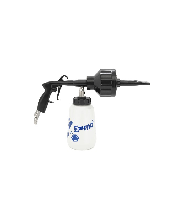Пистолет требует подключения к источнику сжатого воздуха (компрессору или воздушной магистрали). Емкость для моющего средства позволяет использовать различные чистящие растворы. Сменные насадки обеспечивают регулировку формы струи для разных типов очистки — от точечного до широкого распыления.
