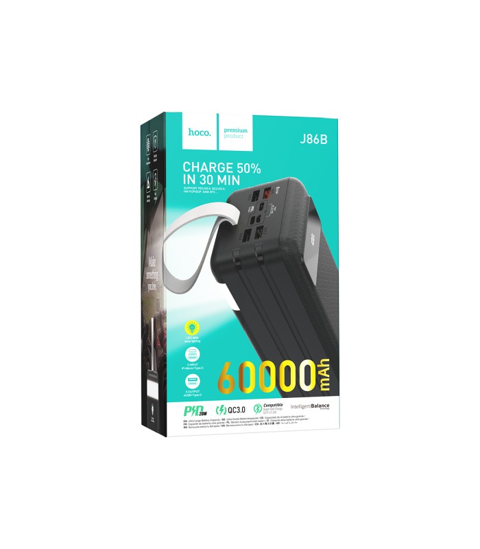 Power Bank HOCO J86B 60000mAh, 4USB+2Type-C+Lighting+micro, 22.5W+PD20W, фонарик, Black, 1.33kg