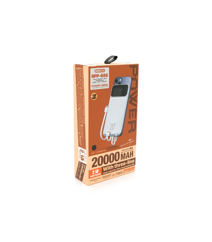 Power Bank Remax RPP-686 20000mAh, с кабелями USB+Type-C+Lighting, Black, 0.46kg