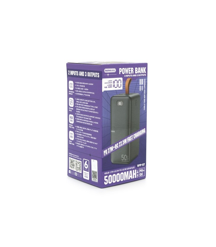 Power Bank Remax RPP-117 50000mAh, PD 27W+QC 22.5W, Black, 1.015kg
