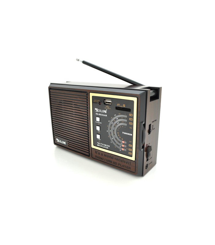 Радиоприёмник GOLON RX9933UAR принимает трансляций радиостанций в FM,AM,SW диапазонах и воспроизводит аудиофайлы в формате MP3,WMA. Радиоприемник портативный и может работает от сети 220 В, встроенного аккумулятора и от батареек. На боковой стороне радиоприемник находится переключатель, который позволят воспроизвести радио в частотах AM, SW, FM или переключить воспроизведение музыки на разъемы USB или SD. Наличие портов USB или SD позволяет прослушать музыку с USB накопителя или с карты памяти SD, а при наличии переходника SD – MICRO SD.