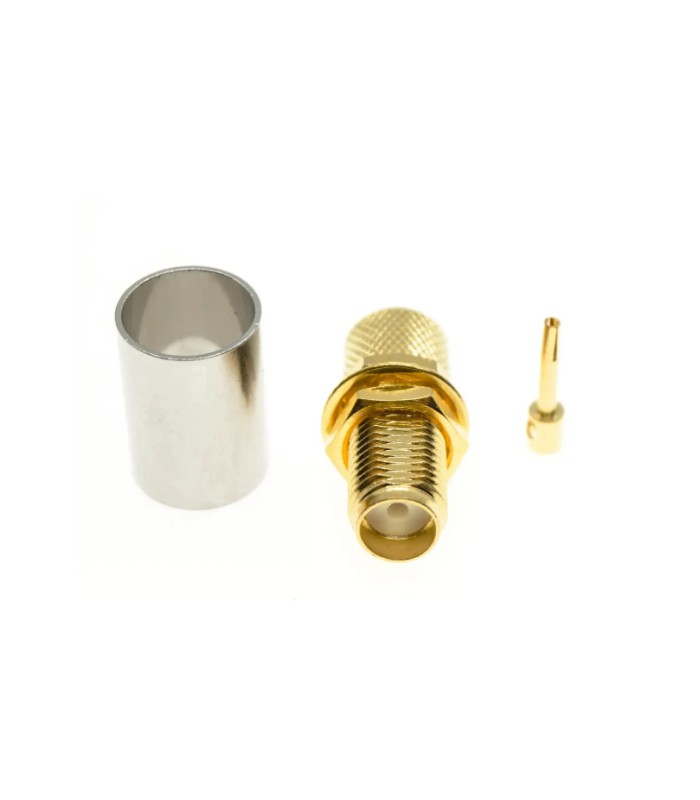 Разъем ВЧ SMA Female для кабеля RG6, RG5, LMR300, RG304, ЖК-75, 5D-FB и аналогов с наружным диаметром изоляции до 8 мм и центральной жилой до 1.8 мм. Центральный пен монтируется на центральный провод кабеля методом пайки (возможно обжим). Разъем зажимается на кабеле обжимным инструментом (кримпером).