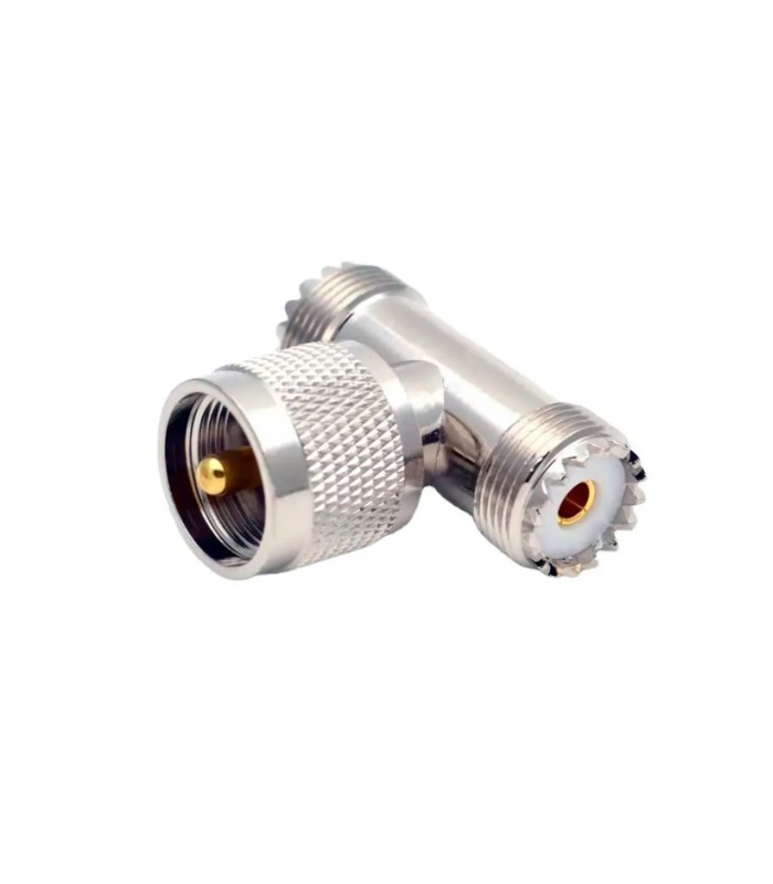 Переходник имеет 1 разъем UHF Male (с внутренней резьбой и штырьком внутри) и 2 разъема UHF Female (с наружной резьбой и без штырька). С помощью этого разъема можно, например, организовать схему подключения двух антенн к одному разъему и т.п.
