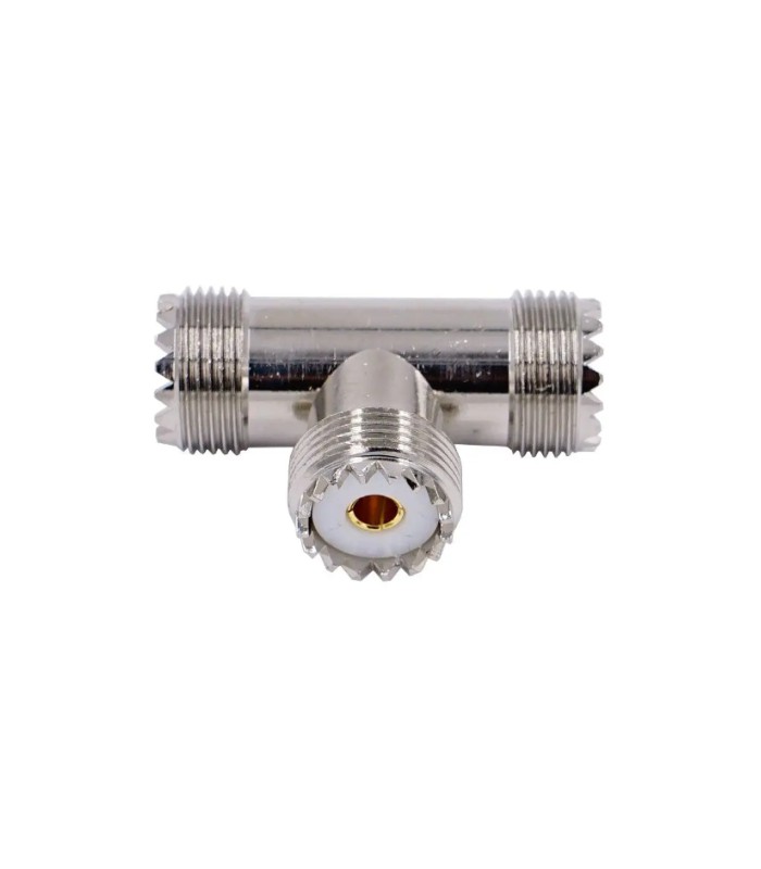 Переходник имеет 3 разъема UHF Female (с наружной резьбой и без штырька). С помощью этого разъема можно, например, организовать схему подключения двух антенн к одному разъему и т.п. п.