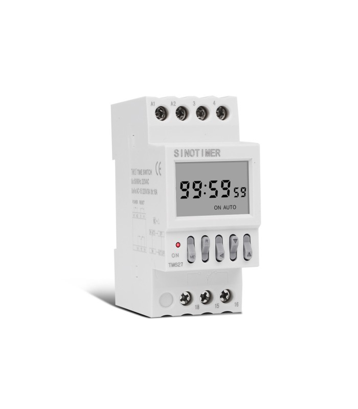 Реле времени Sinotimer TM627 предназначено для установки на DIN-рейку. Оно оснащено ЖК-дисплеем и имеет функцию программирования. Максимальная нагрузка составляет 16А при напряжении 220V. Габаритные размеры устройства составляют 82х68х36 мм.