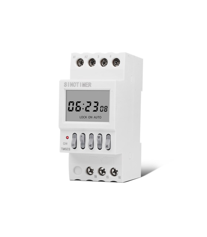 Реле времени Sinotimer TM623 предназначено для установки на DIN-рейку. Оно оснащено ЖК-экраном и имеет возможность программирования. Максимальная нагрузка составляет 16А при напряжении 220V. Габариты устройства составляют 82х68х35мм.