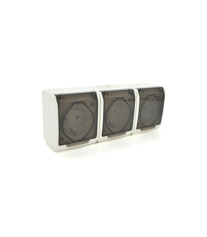 Розетка тройная без заземления наружного монтажа с крышкой YT165, белая, IP44.