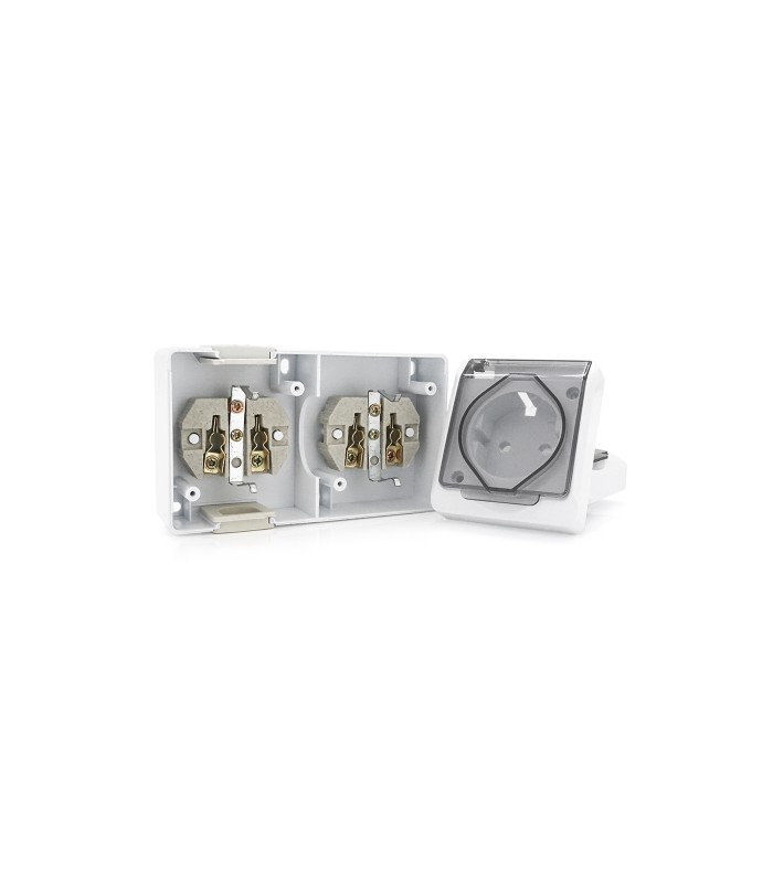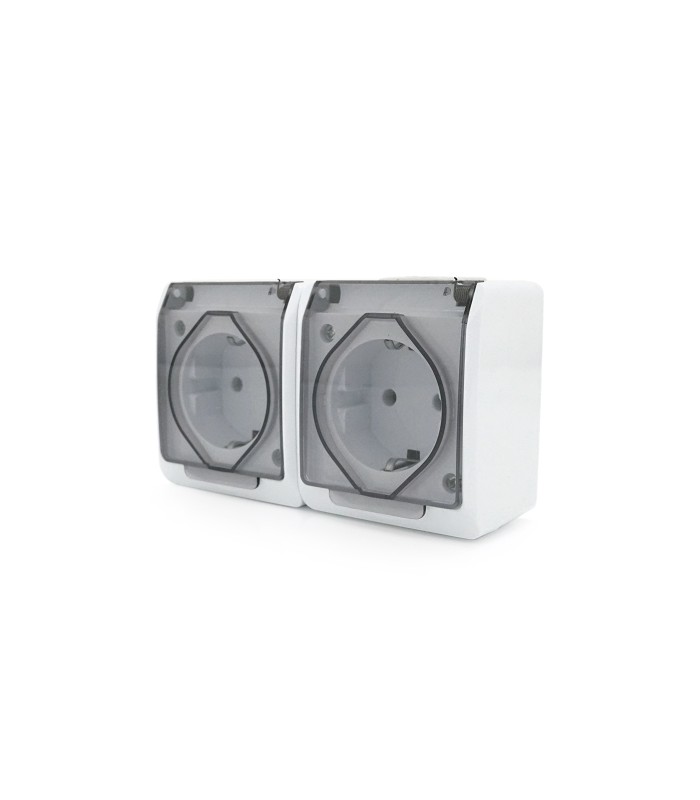 Розетка двойная без заземления предназначена для наружного монтажа и обеспечивает защиту от пыли и брызг воды. Имеет белый цвет и крышку для защиты от погодных условий.
