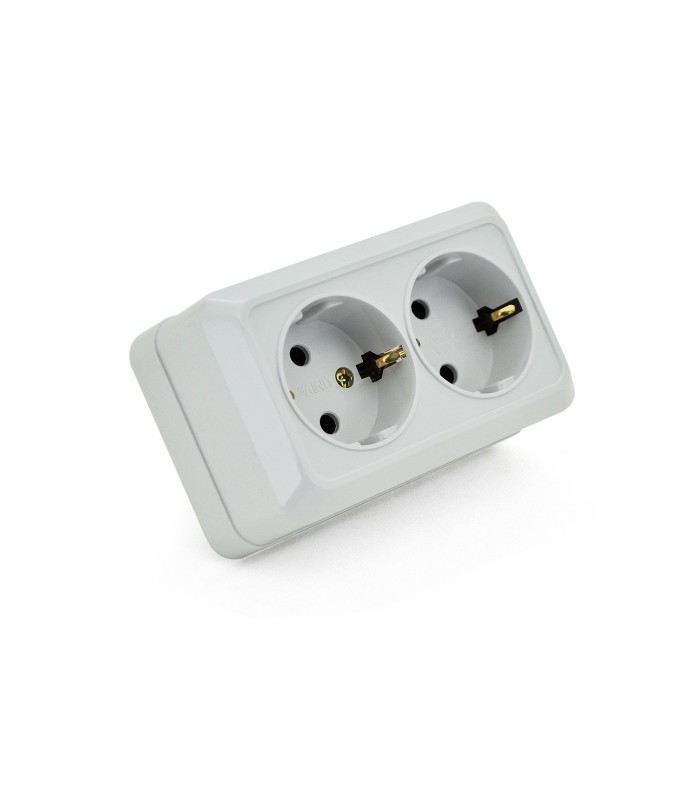 Двойная розетка с заземлением предназначена для наружного монтажа и имеет белый цвет.