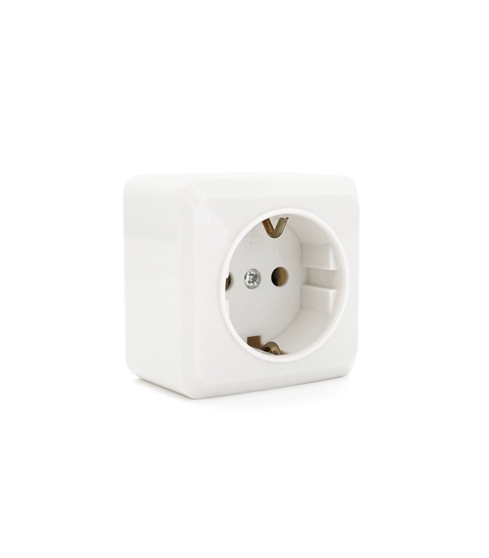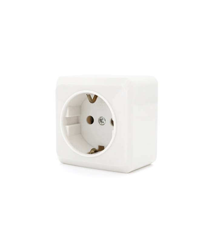 Розетка с заземлением накладная предназначена для наружного монтажа и имеет бежевый цвет.