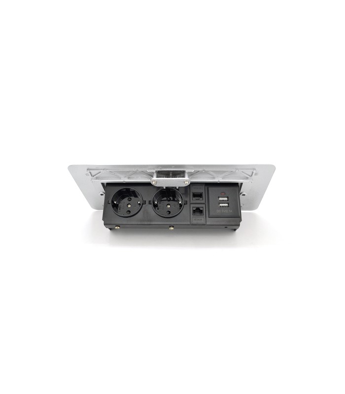 Розетка напольная выдвижная с заземлением J29L, две розетки + 2*USB + 2*RJ45 - применяется для установки в столах и фальшполах, имеет степень защиты IP40.