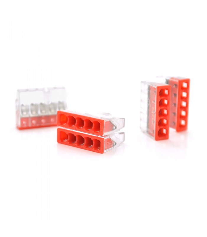 Самозажимная 5-проводная клемма WAGO К773-205 предназначена для соединения до пяти проводов. Она имеет прозрачно-красный цвет, что делает ее легко различимой.