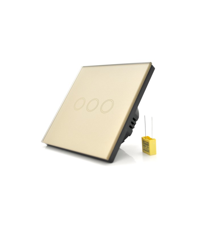 Сенсорный выключатель AOYAN представляет собой трехканальный устройство в золотистом цвете. Его размеры составляют 86х86х35мм.