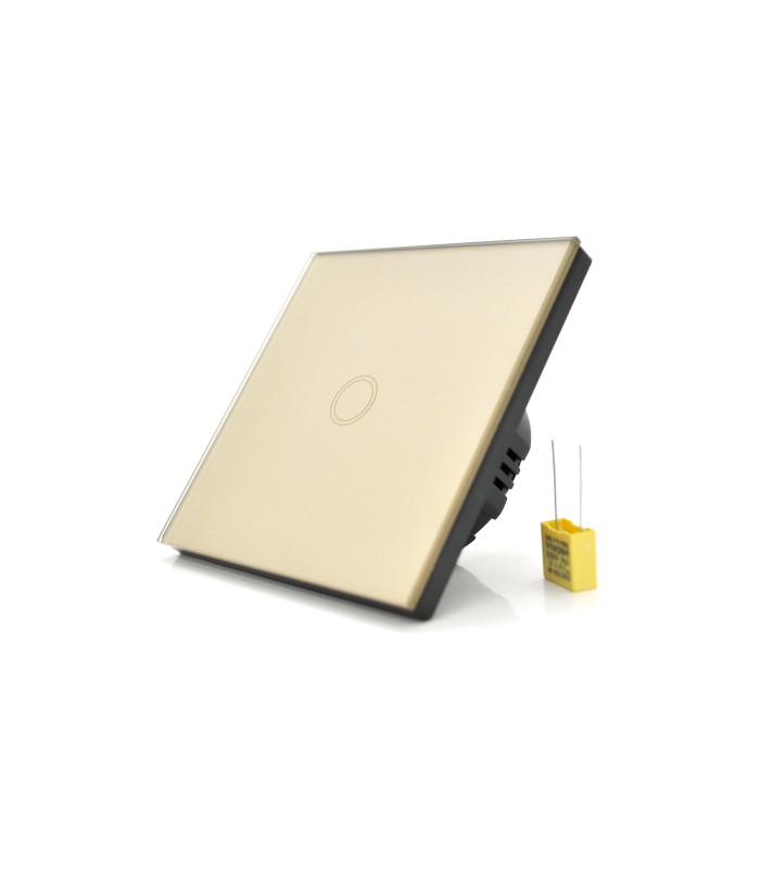 Сенсорный выключатель AOYAN представляет собой одноканальное устройство в золотистом цвете. Его размеры составляют 86х86х35мм.