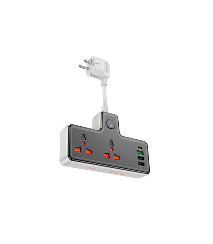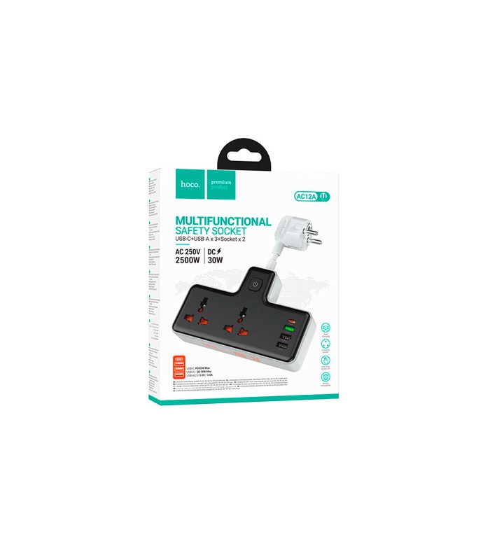 Сетевой фильтр HOCO AC12A на 2 розетки + 3 USB+ USB-C, 30W, кабель 1м, 220В, Black, Box