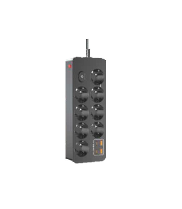 Сетевой фильтр на 8 розетки + 2 USB выхода 5V-2.4A + 2PD, кнопка включения с индикатором, 10A, 240V/2500W, Black
