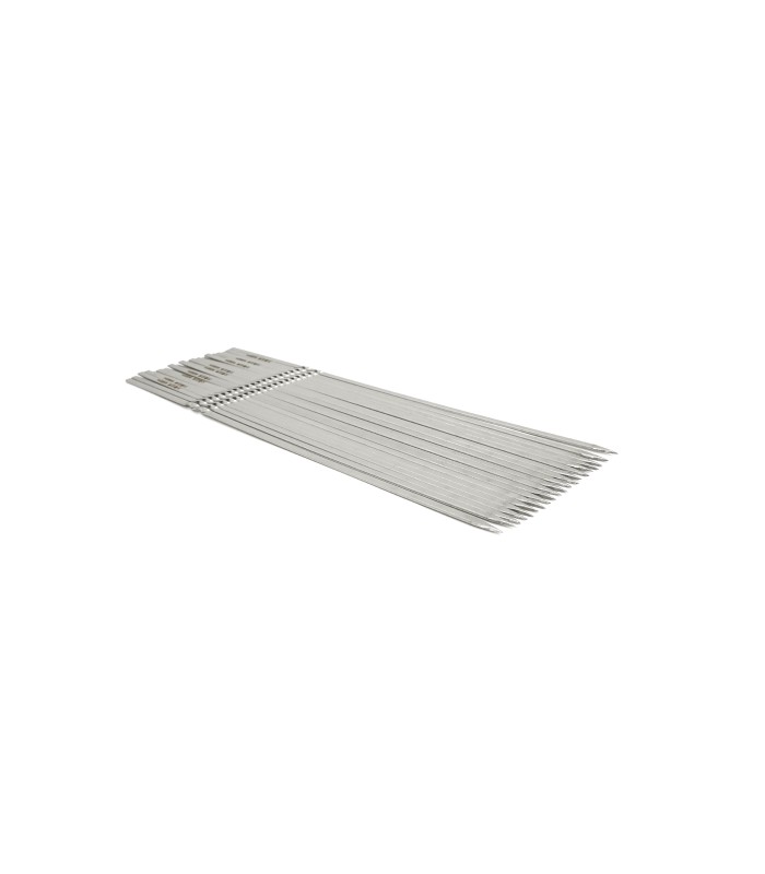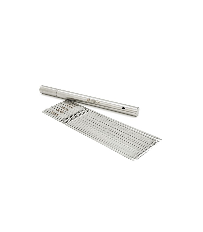 Набор шампуров в тубе представляет собой набор из 20 шампуров из нержавеющей стали. Длина каждого шампура составляет 40 см, ширина - 5 мм, толщина - 1,8 мм.