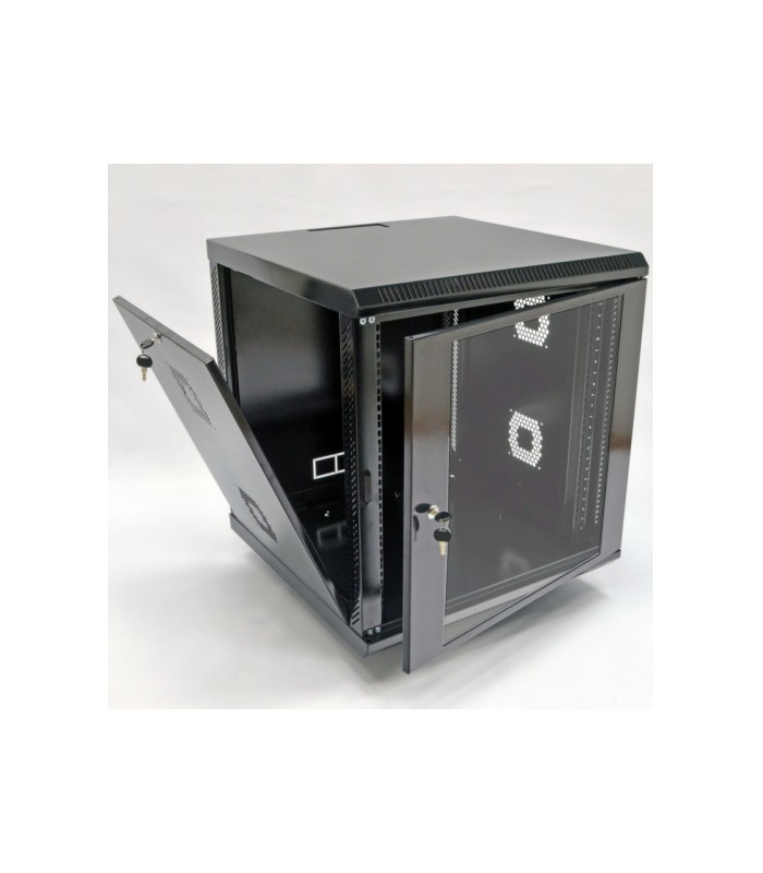 Этот товар представляет собой шафу 12U из акрилового стекла в черном цвете. Она имеет размеры 600х600х640 мм (ширина, глубина, высота).