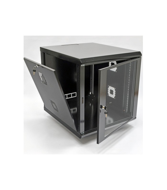 Шафа 12U, с размерами 600х700х640 мм (ширина*глубина*высота), изготовлена из акрилового стекла в черном цвете.