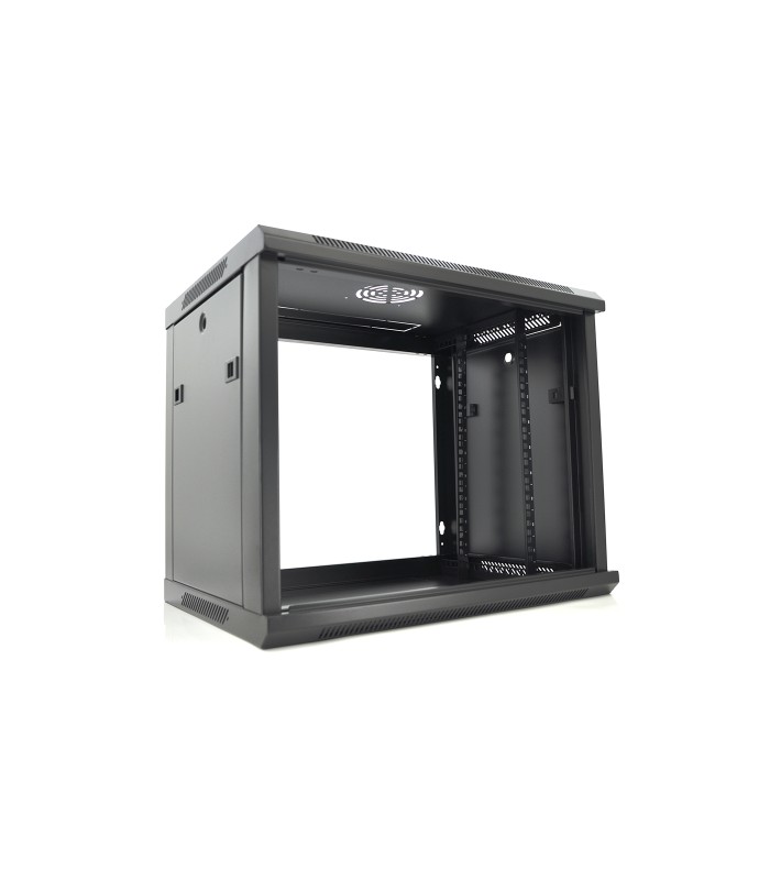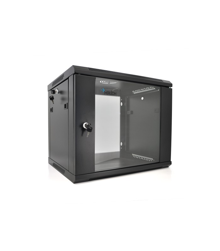 Шкаф Merlion 9U. Привлекательный внешний вид, дверь из закаленного стекла, неброский черный цвет. В верхней крышке шкафа предусмотрено местао для установки вентилятора охлаждения. Внешняя высота составляет 500 мм, наружная глубина – 450 мм. Боковые двери – съемные, на замках. Передняя дверь из закаленного стекла с наличием замка для предотвращения нежелательного доступа к оборудованию.