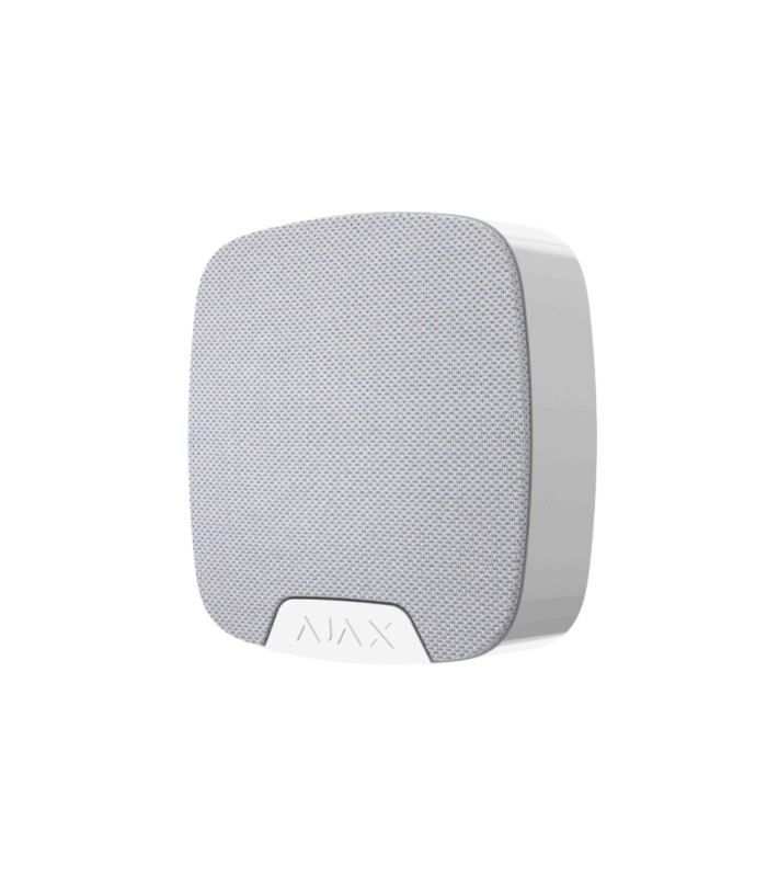 Беспроводная комнатная сирена Ajax HomeSiren белая предназначена для звукового оповещения о тревоге и устанавливается внутри помещений. При тревоге, умная централь сигнализации Ajax Hub передает беспроводной сигнал на сирену. После получении сигнала тревоги от централи сирена срабатывает и раздается сигнал тревоги.