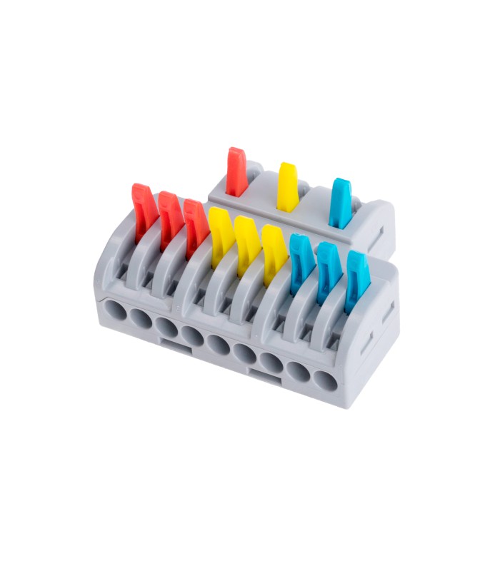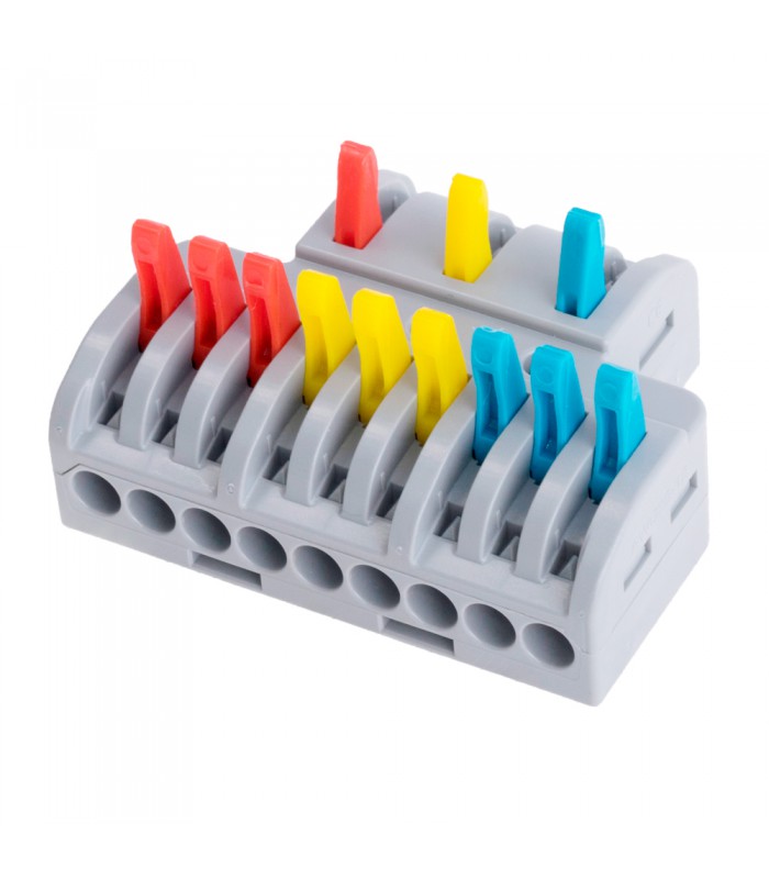 Клеммная колодка LT-933 предназначена для использования в распределительных коробках. Она оснащена нажимными зажимами для удобного подключения проводов. Эта колодка подходит для проводов диаметром 3x9 мм и имеет номинальное напряжение 450V и ток 32A. Цвет корпуса - серый.