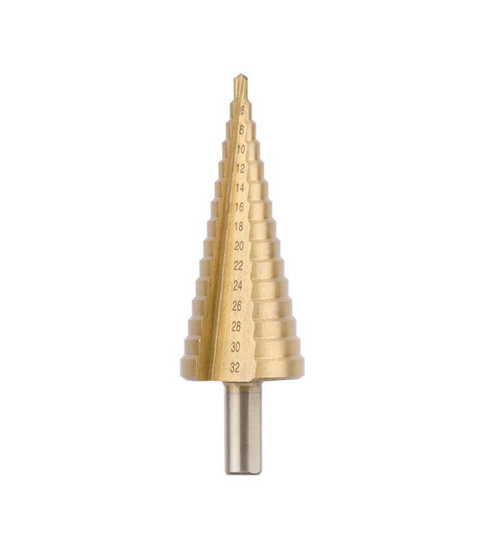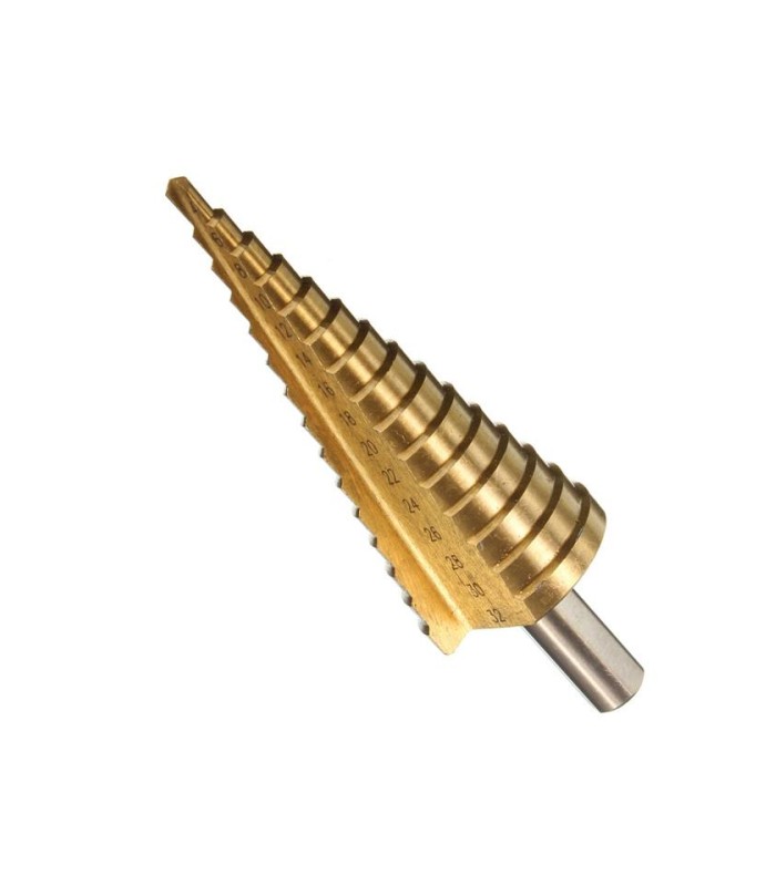 Сверло имеет коническую форму, с увеличивающимся диаметром на 2 мм за шаг. Режущие кромки из HSS стали, эффективно справляются со своей работой и долго остаются острыми. При необходимости сверло можно заточить.