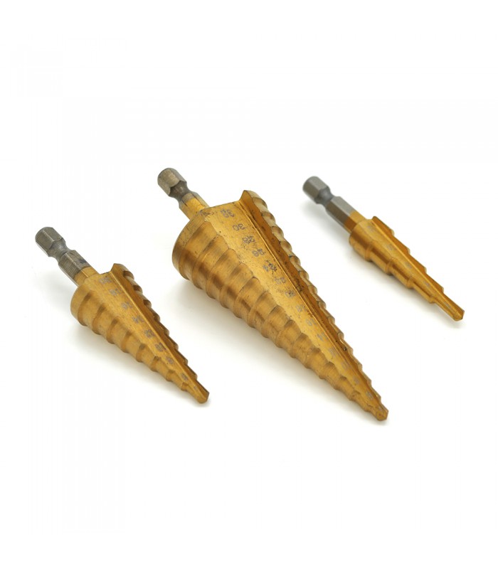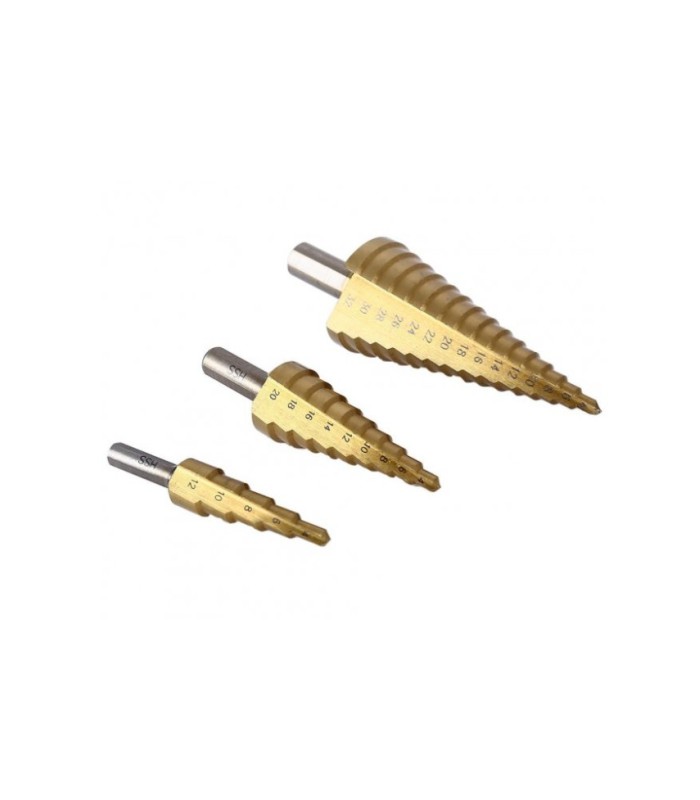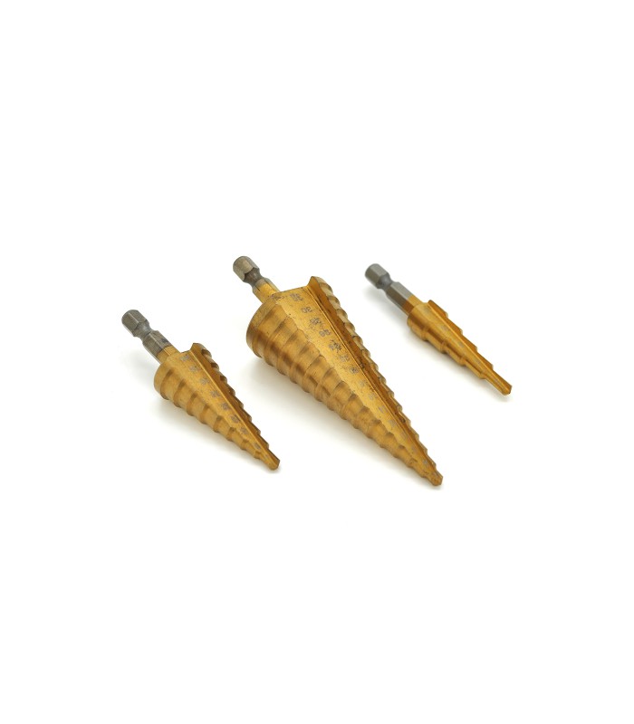 Сверла имеют коническую форму, с увеличивающимся диаметром на 2 мм за шаг. Режущие кромки из быстрорежущей стали (HSS), эффективно справляются со своей работой и долго остаются острыми. При необходимости сверла можно заточить.