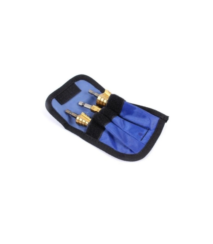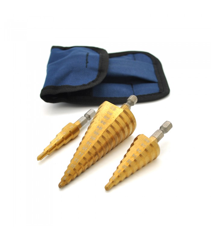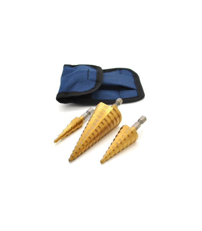 Сверла имеют коническую форму, с увеличивающимся диаметром на 2 мм за шаг. Режущие кромки из быстрорежущей стали (HSS), эффективно справляются со своей работой и долго остаются острыми. При необходимости сверла можно заточить.