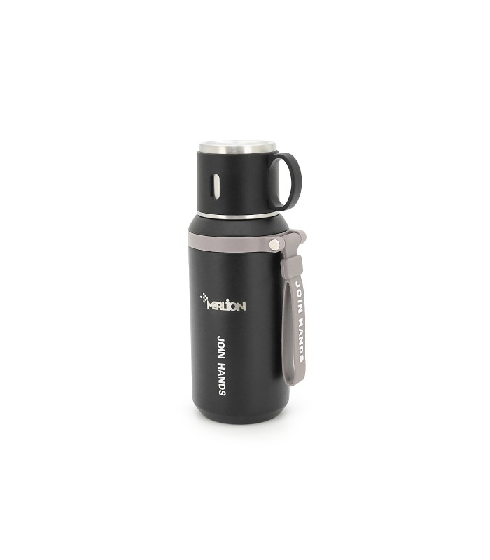 Термос для чая Merlion из нержавеющей стали, с ситечком, чашкой и ручкой для переноски, объем 600 мл., черный