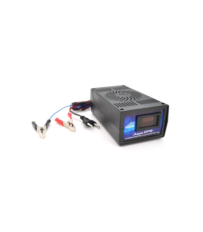Автоматическое трансформаторное зарядное устройство ТР-6, предназначенное для зарядки 12 В аккумуляторных батарей емкостью от 32 до 100А*ч, зарядным током до 7А. Устройство выполнено в пластиковом корпусе. На лицевой панели есть индикатор заряда и цифровой амперметр. Защита от перегрева