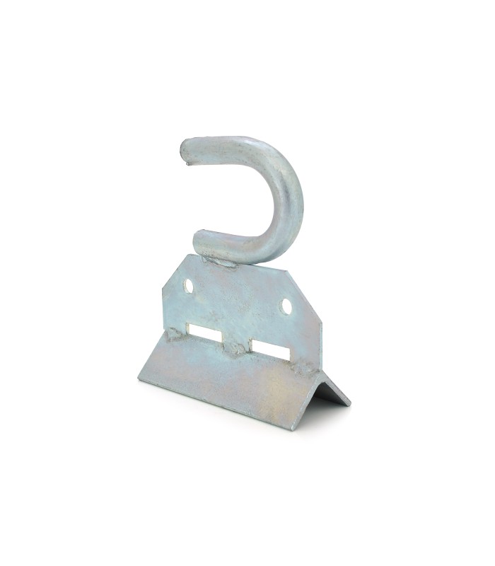 Уголок имеет ребро жесткости, исключает возможность ослабления или деформации основания в процессе эксплуатации крюка под бандажной лентой.