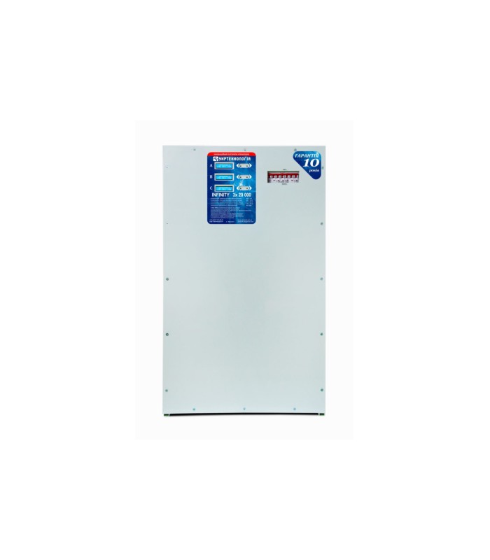 Стабилизатор напряжения трехфазный состоит из трех независимых стабилизаторов НСН собранных и коммутируемых в одном корпусе. Конструктивно стабилизатор выполнен в металлическом корпусе, позволяющем эксплуатировать его в напольном варианте. На лицевой панели расположены ЖК индикаторы, показывающие (по умолчанию) уровень входного и выходного напряжений, ток и номер ступени.