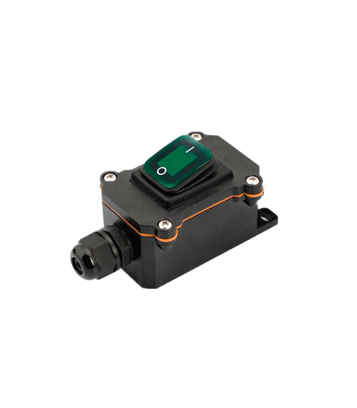 Переключатель наружного монтажа представляет собой зеленую кнопку с подсветкой, защищенную по стандарту IP65. Устройство рассчитано на работу при напряжении 12-24V и имеет черный цвет.
