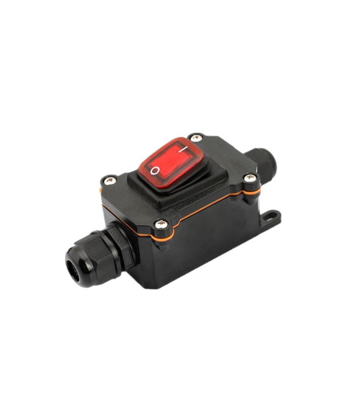 Переключатель наружного монтажа с красной кнопкой, двухсторонним выводом, защитой IP65, работающий от 12-24V. Цвет - черный.