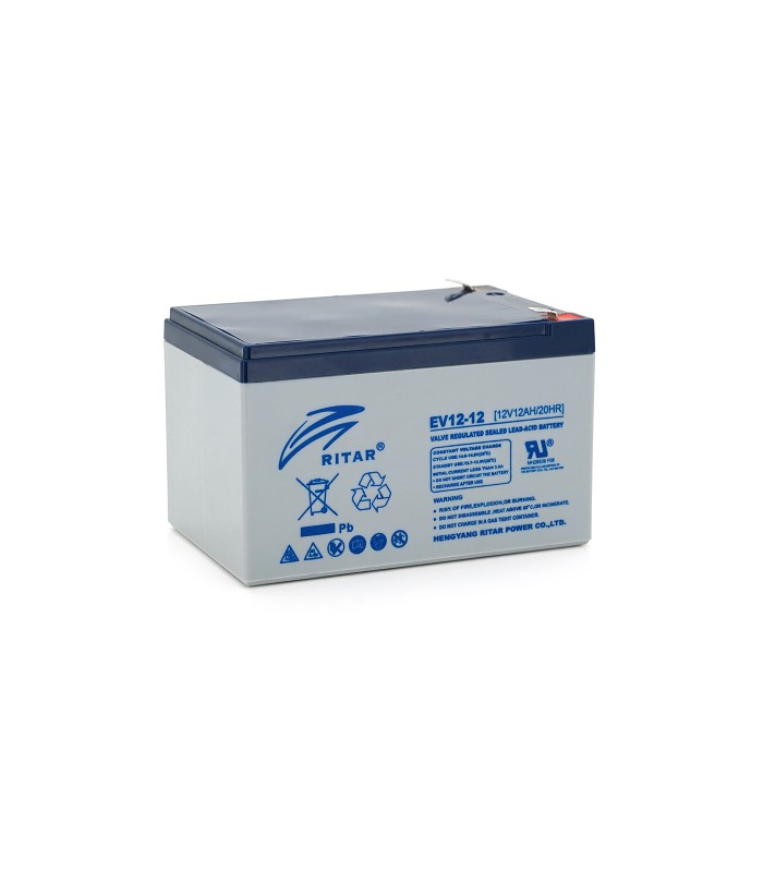 У аккумулятора RITAR EV12-12 номинальный ток заряда составляет 1.2А, а пусковой ток - 100А, что делает его весьма мощным и эффективным в обработке пиковых нагрузок. Тип клеммы - T12 (под болт М5), обеспечивает прочное и надежное соединение.