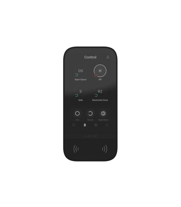KeyPad TouchScreen оборудована встроенным зуммером, сенсорным дисплеем и считывателем для бесконтактной авторизации. Клавиатуру можно использовать, чтобы управлять режимами охраны и устройствами автоматизации, а также уведомлять о тревогах в системе.