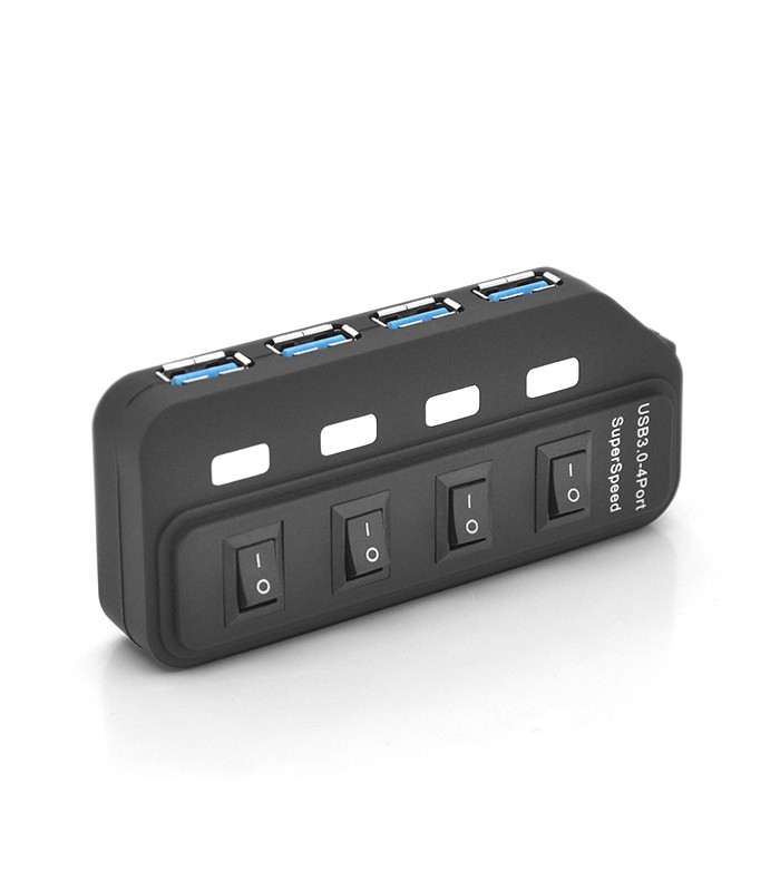 Зручний USB-концентратор із чотирма портами, оснащений індивідуальними перемикачами для кожного порту. Дозволяє підключати та вимикати пристрої без необхідності фізичного вилучення кабелів. Підтримує високошвидкісну передачу даних та роботу з накопичувачами об'ємом до 2ТБ.