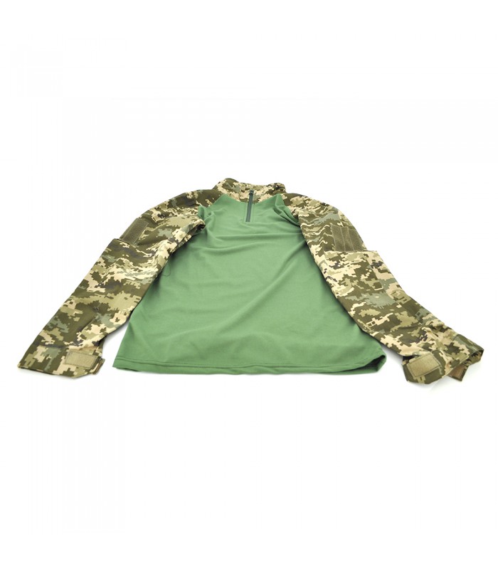 Тактическая рубашка Ubacs чаще всего используется для ношения под бронежилетом. Также его можно носить открыто, одевать под куртку или кофту. Материал рукава – 70% хлопок, 30% полиэстер. Такой материал прочен, приятен к телу, хорошо отводить воздух. Основная часть убакс – сетчатый дышащий материал Coolmax из 100% полиэстера. Он мягкий на ощупь, быстро отводит пот от тела и пропускает воздух. Воротник - стойка снабжена молнией, позволяющей держать горло открытым, манжеты регулируются с помощью специальных липучек. На рукавах имеются тактические накладные карманы с клапанами на липучках. На них размещены платформы велкро для крепления шевронов.