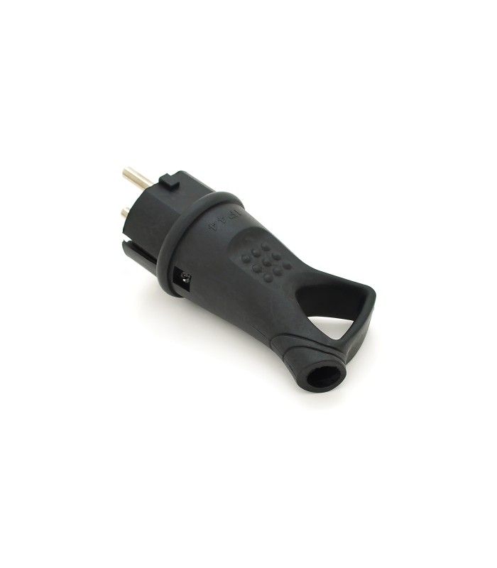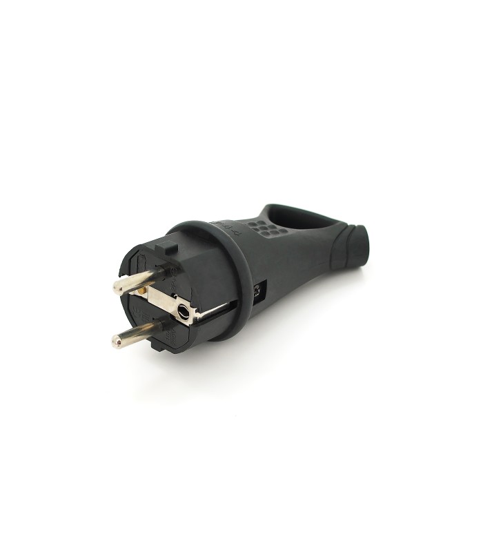 Вилка каучуковая с заземлением черного цвета. Корпус изготовлен из каучука, что дает дополнительную защиту от влаги.