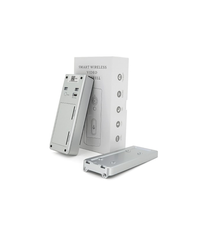 После установки, подключения к WiFi сети и небольшой настройки в приложении Вы сможете использовать все функции видео звонка . Внешне вызывная панель имеет стандартную прямоугольную форму, а корпус выполнен из прочного ABS пластика. На передней стороне находится объектив камеры, рядом с которым расположена инфракрасная подсветка и датчик освещенности. Ниже объектива находится динамик, кнопка вызова и отверстие микрофона, а выше объектива расположен PIR датчик. Сверху (в торце) разъемы для TF-карты и Micro USB, а на задней стороне кнопка «RESET» и отсек для элементов питания (аккумуляторных батарей 18650).