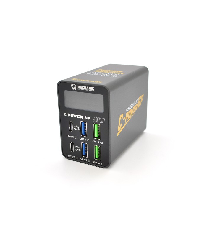 MECHANIC C-Power 6P представляет собой современную компактную зарядную станцию, оснащенную шестью интеллектуальными портами для одновременного питания различных устройств. Устройство сочетает в себе передовые технологии зарядки, включая поддержку стандартов PD3.1 и QC3.0, что обеспечивает оптимальную скорость зарядки для каждого подключенного гаджета. Встроенный цифровой дисплей позволяет контролировать параметры работы в реальном времени.