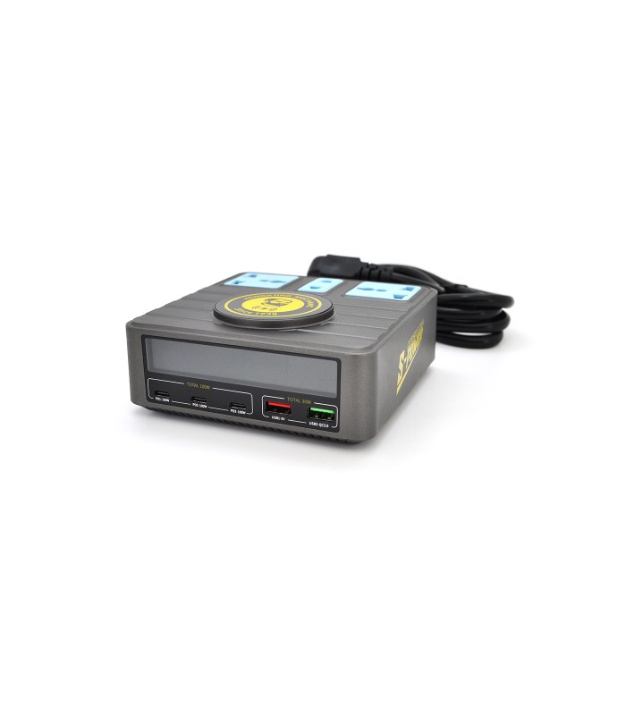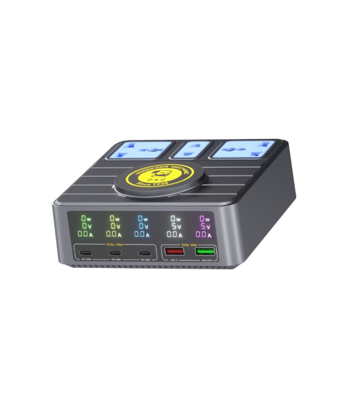 Зарядная станция MECHANIC S-Power — это современное многофункциональное устройство, разработанное для удобной и быстрой зарядки всех ваших гаджетов одновременно. Благодаря комбинации трёх розеток переменного тока, трёх типов портов USB (включая быстрые стандарты PD и QC3.0) и беспроводной зарядки, станция идеально подойдёт для использования дома, в офисе или в поездке. Цифровой дисплей отображает текущее напряжение в сети, позволяя контролировать стабильность электропитания и избегать рисков, связанных с перепадами напряжения.