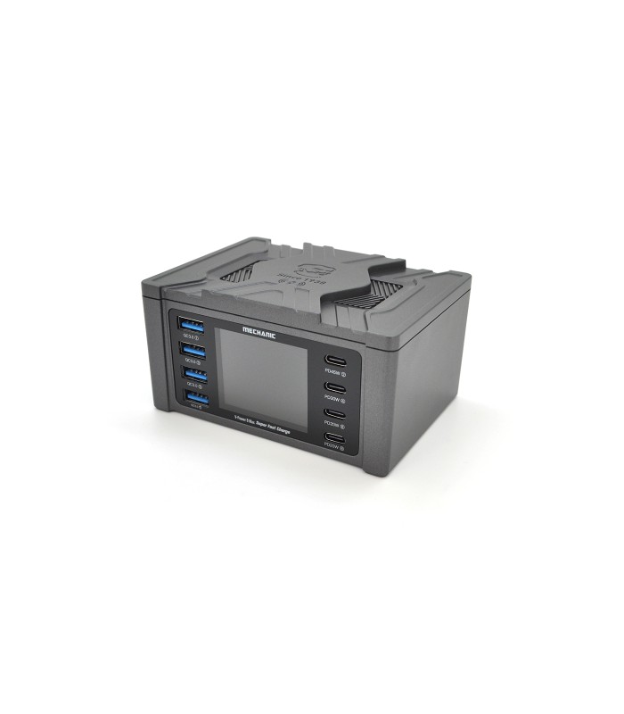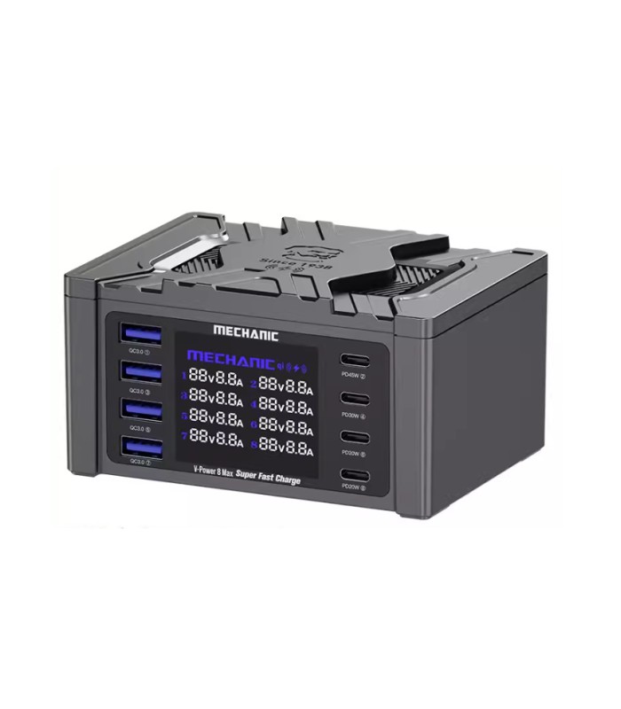 Зарядная станция MECHANIC V-Power 8 Max — это мощное и функциональное решение для одновременной зарядки нескольких устройств в домашних, офисных или мобильных условиях. С восемью портами, включая четыре USB-C с поддержкой Power Delivery 3.1 и четыре порта QC3.0, станция обеспечивает высокую скорость зарядки смартфонов, планшетов, ноутбуков, умных часов и других гаджетов. Благодаря цифровой индикации вы всегда видите текущее напряжение в сети, что позволяет контролировать качество электропитания и своевременно реагировать на перепады.