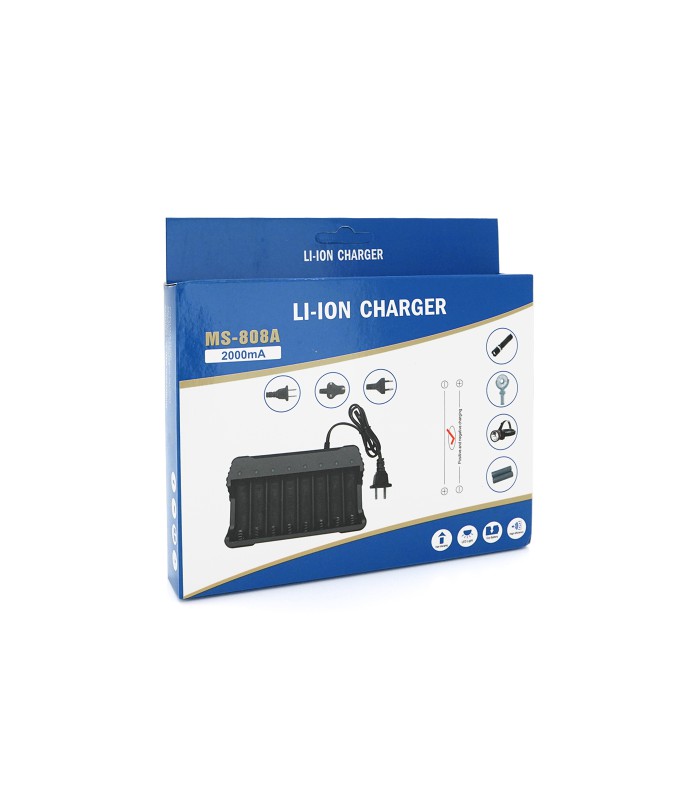 Зарядное устройство MS-808A предназначено для зарядки восеми аккумуляторов типа 18650. Устройство имеет выходное напряжение 4.2V и емкость 2000mAh.
